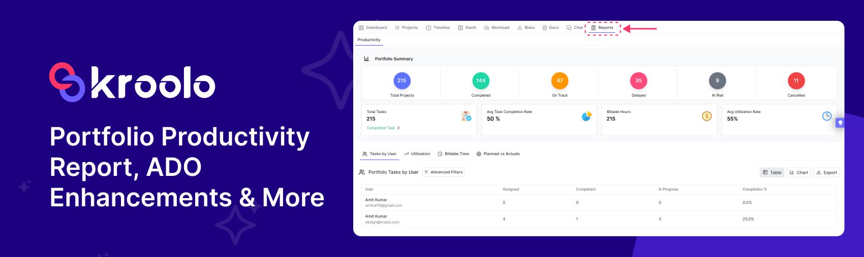 Prebuilt and customizable project-level reports for progress, effort, budget, risks, and timelines to aid stakeholder visibility and PMO governance.